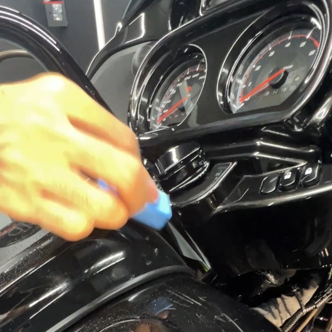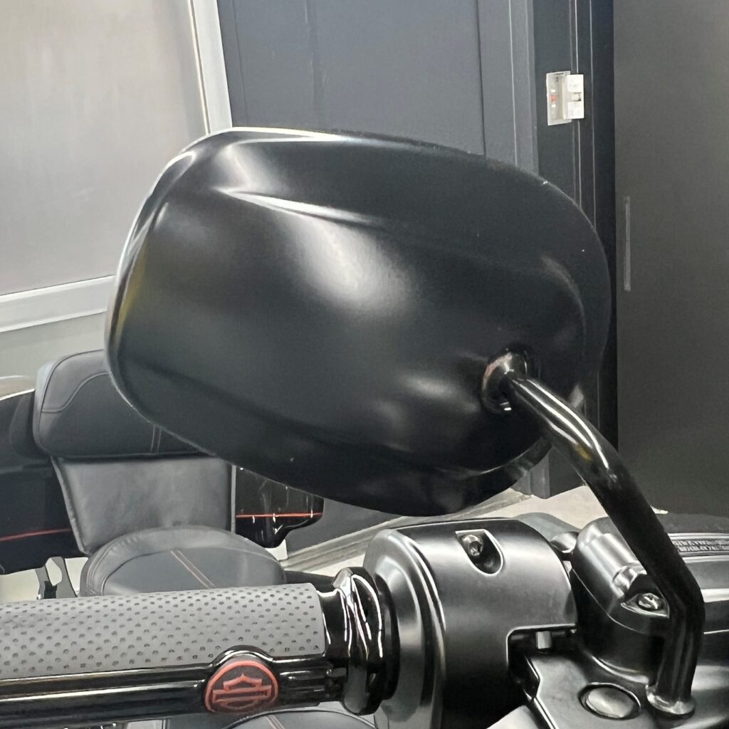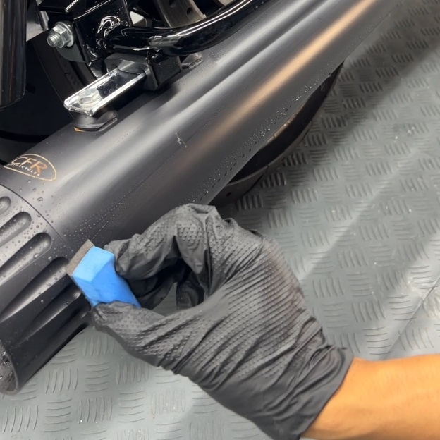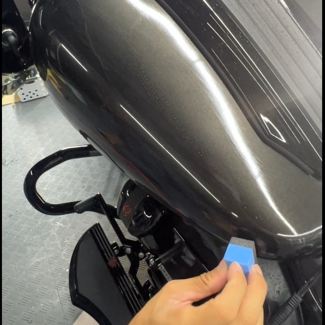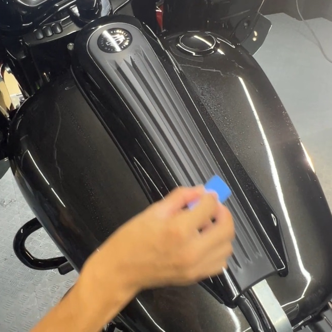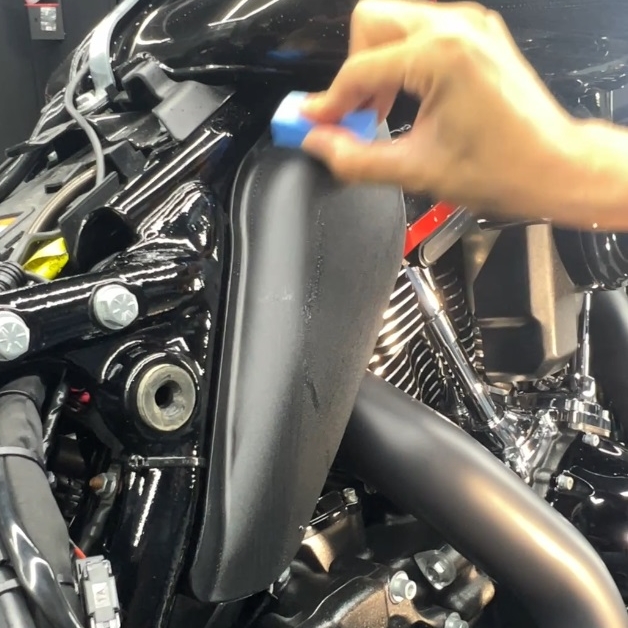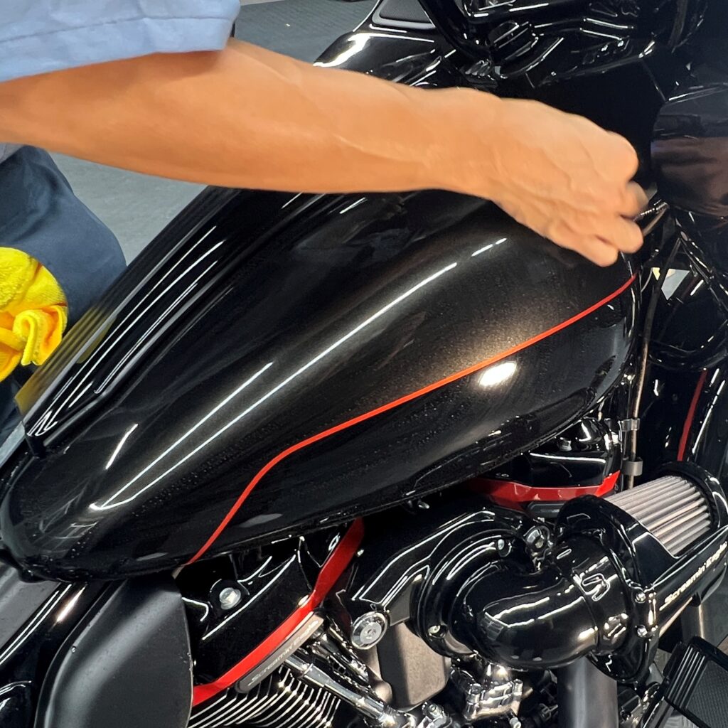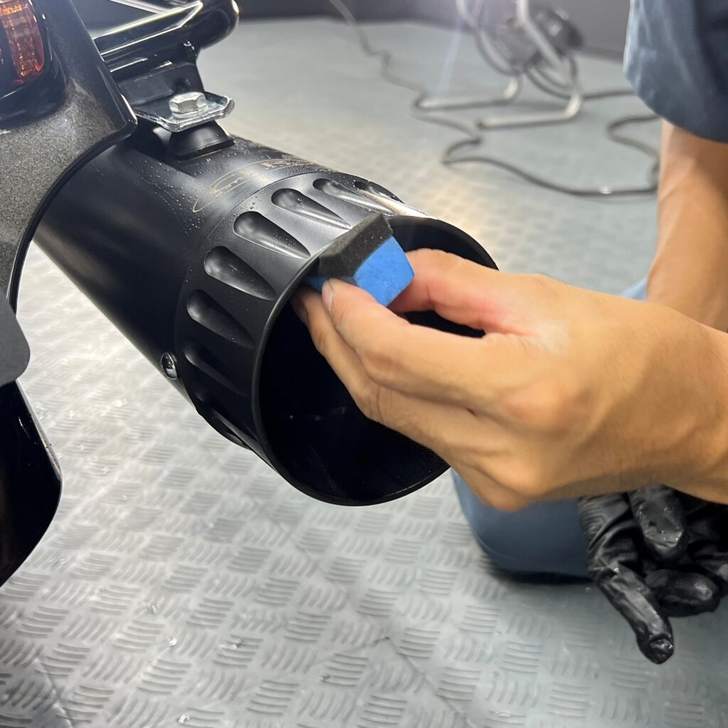 余分な油分や汚れから落としていきます。除去した後、下地処理を進めていきます。ハーレーの塗装は非常に柔らかい為、塗装を痛めない様、慎重に傷を消していきます。この下地処理が重要な作業になります。下地処理が終わり、仕上げのマジベルセラミックRGC施工の工程を進めていきます。マジベルセラミックRGCのコーティングは全て手塗で、細部までコーティング剤を塗り込んでいきます。