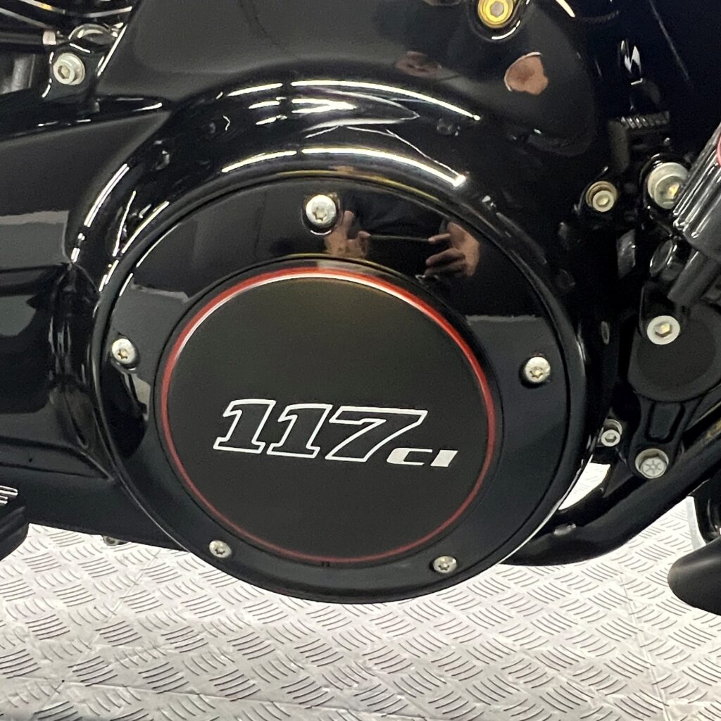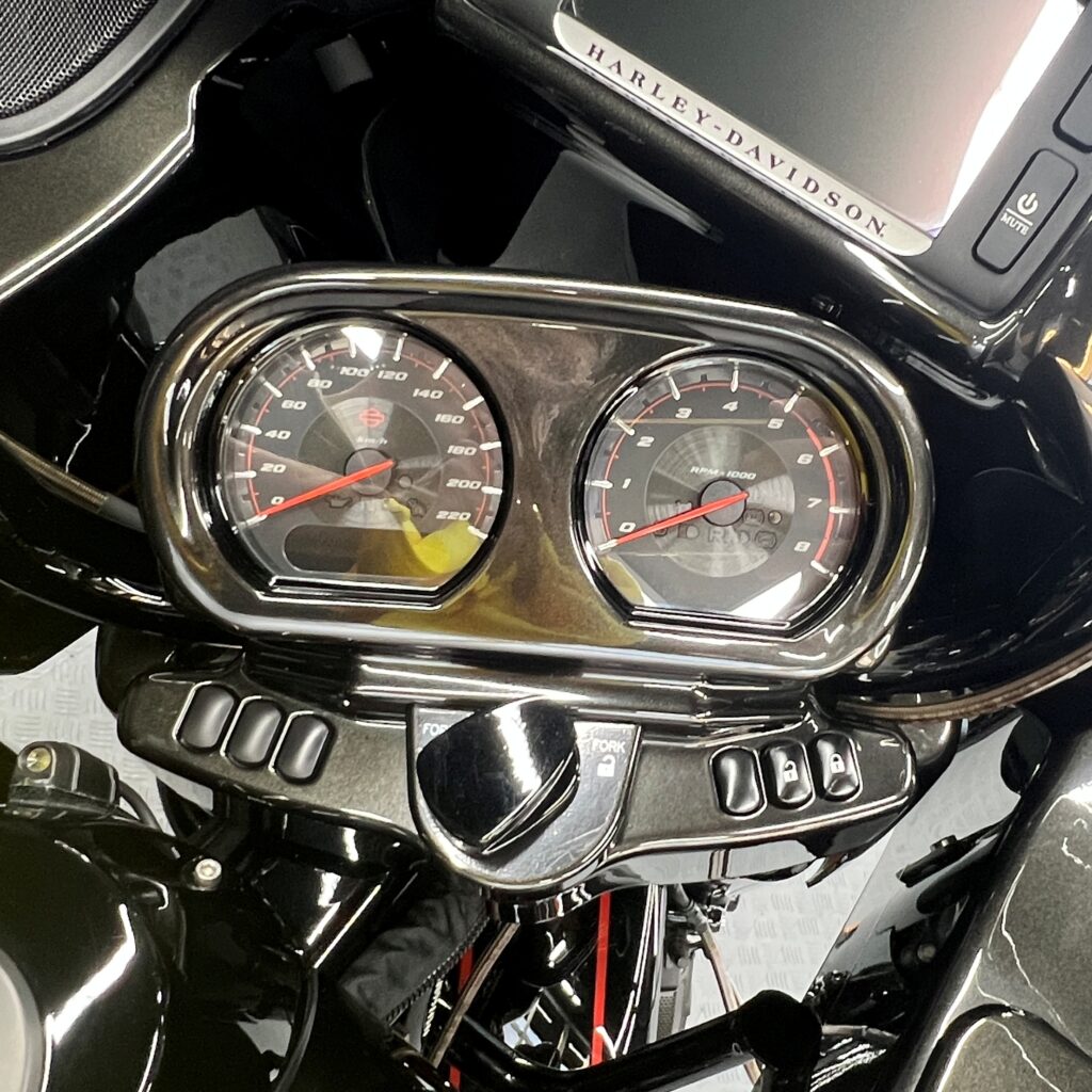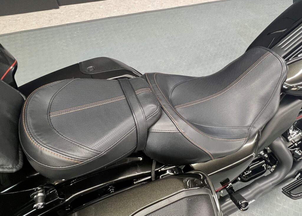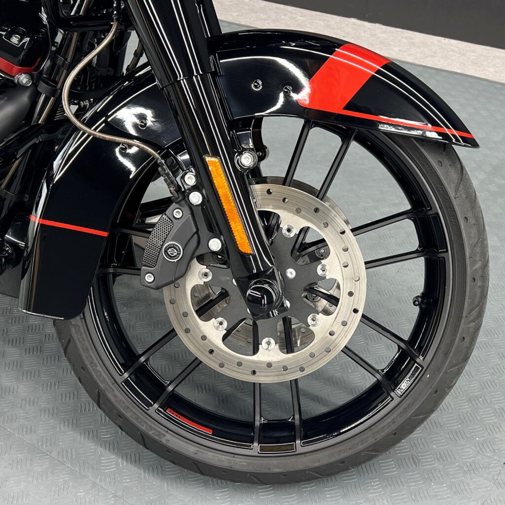 このモデルの心臓部には、当時のCVO専用となる Milwaukee-Eight 117(排気量1917cc)Vツインエンジン が搭載され、力強いトルクと余裕ある加速を発揮します。外観面では、ロードグライド特有の シャークノーズフェアリング(フレームマウント式)と、CVOとして初めて採用された 21インチフロントホイール によって、迫力と存在感を強調しています。装備も充実しており、ナビやオーディオを備えた BOOM! Box 6.5GT インフォテインメントシステム や、ワイヤレス通信に対応するヘッドセット機能を標準搭載。快適性では、調整式の高性能サスペンションと低めのシート高によって、重量級ながら安定感と扱いやすさを両立。