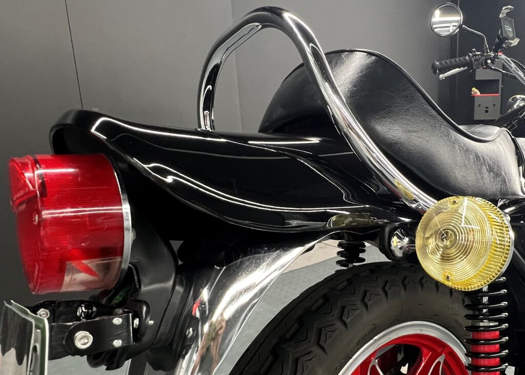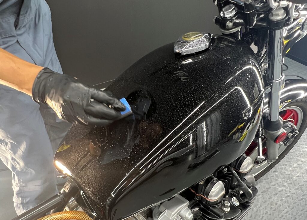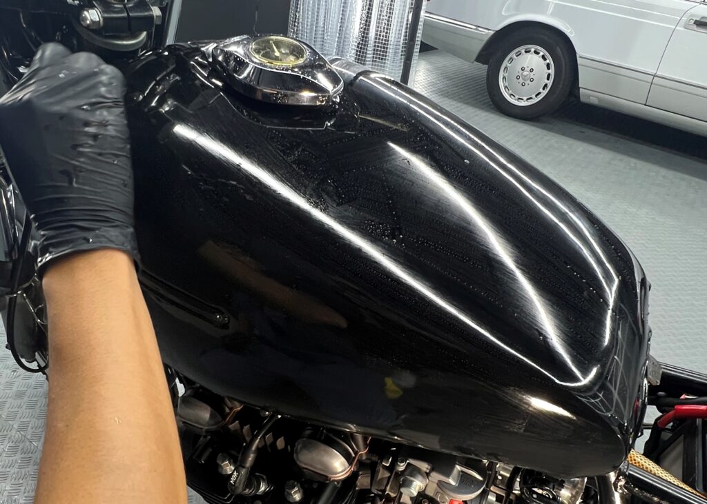 もちろん、ヘッドライト、フレーム、ホイール、シート裏、メーターなどの計器類など全て施工いたします。マジベルセラミックRGCの特徴として未塗装樹脂パーツにも施工は可能で、メーター周りやリアフェンダーの樹脂部分も施工が出来、経年劣化による白化しないことも特徴です。
