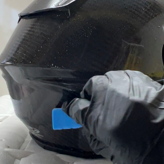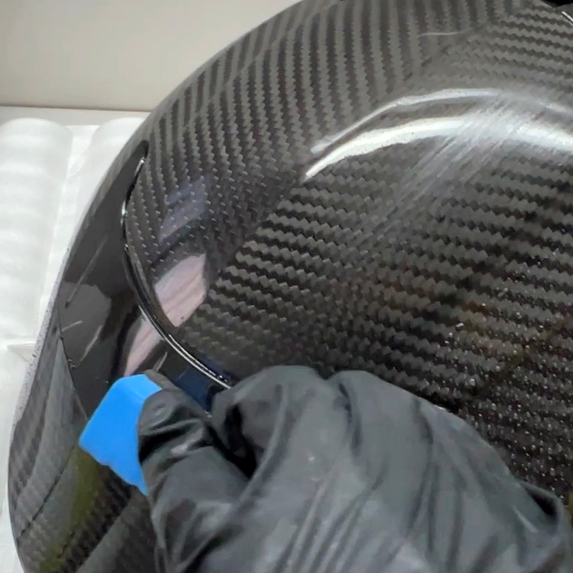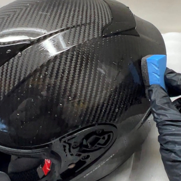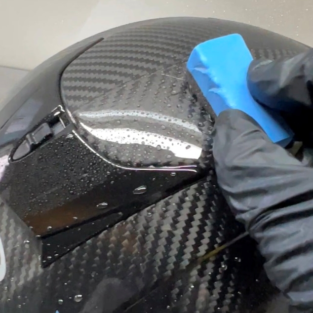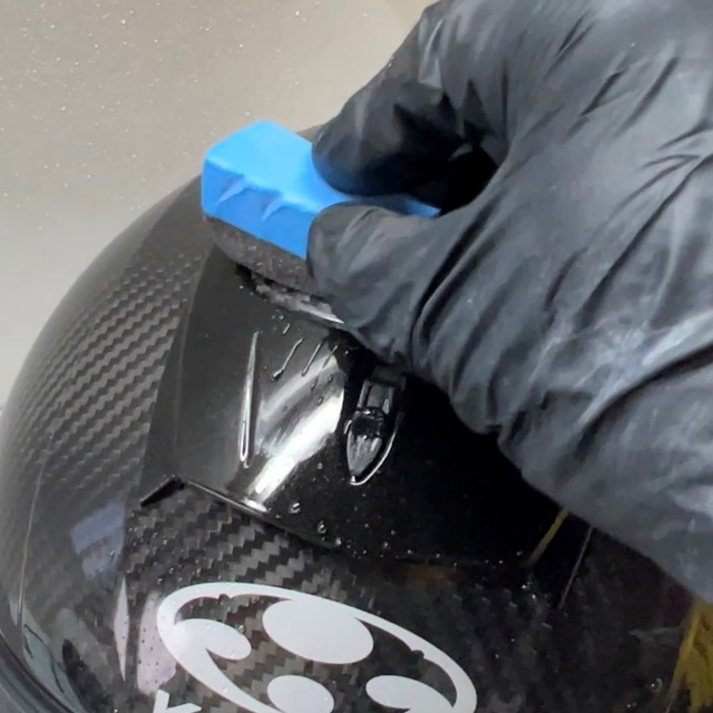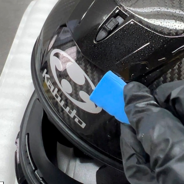 洗浄を終え、帽体・シールドにマジベルセラミックRGCを施工していきます。帽体全体全体をコーティングしていきます。続いて、シールドのコーティングをおこないます。シールは外側、内側両面施工をおこなっていきます。※曇り止め加工の場合は、施工はいたしません。