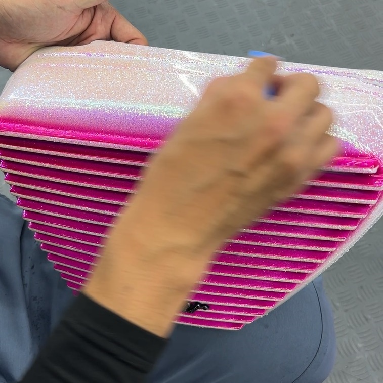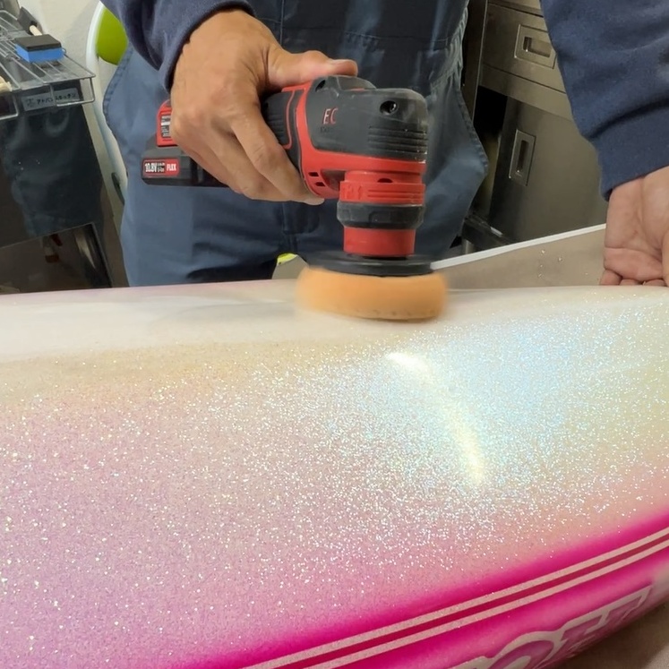 特にホワイトとピンクのコントラストが強い本車両では、わずかな汚れも目立ちます。マジベルでは、磨きによって塗装の透明度を極限まで引き上げ、コーティングの定着率を最大化します。