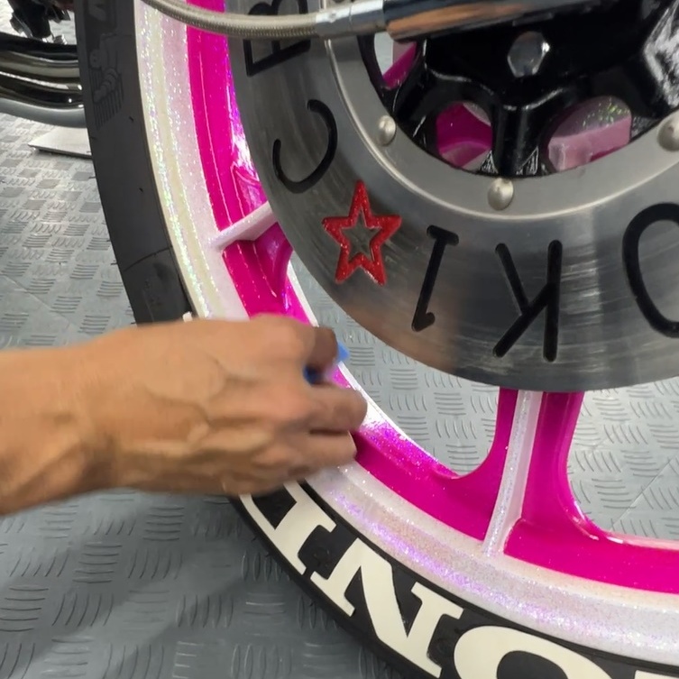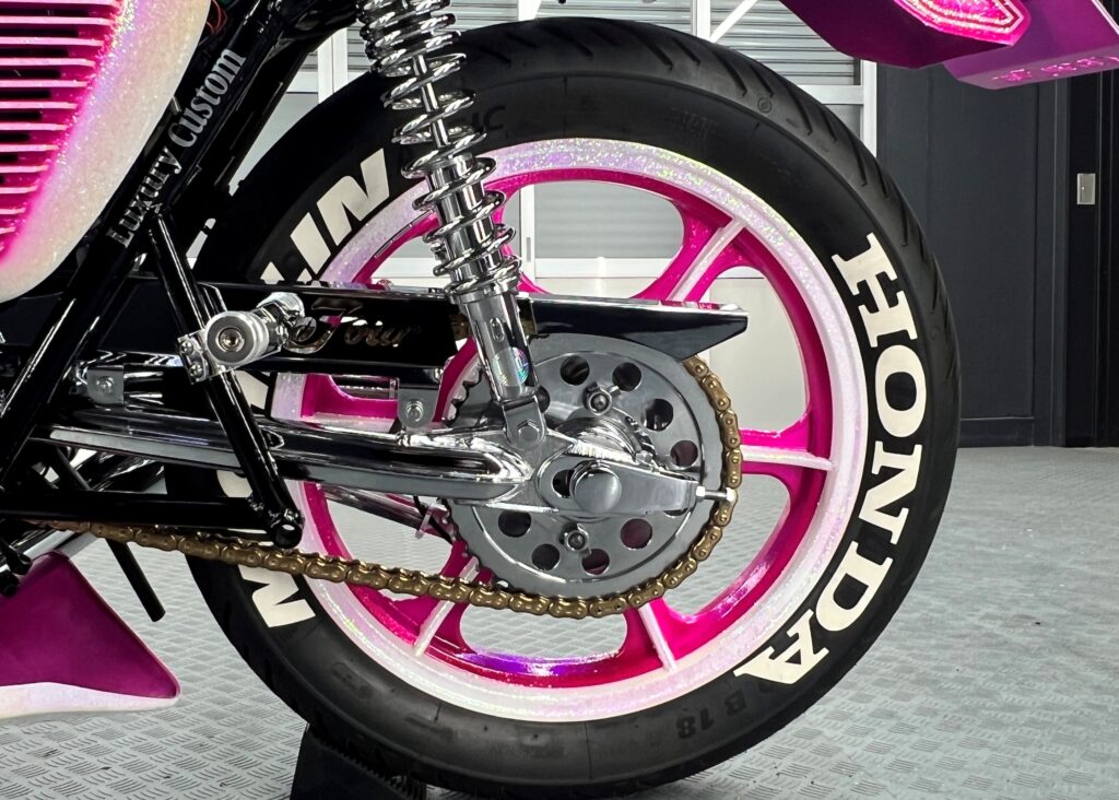 〇足回り:ピンクに塗装された印象的なホイールも、ブレーキダストの固着を防ぎ、金属的な光沢を持続させます。