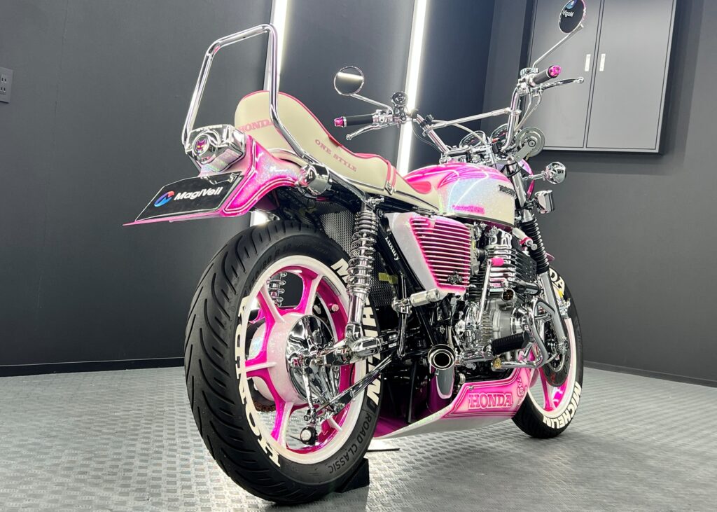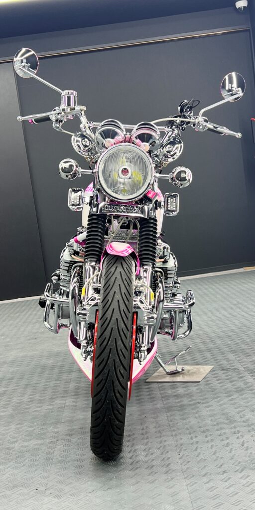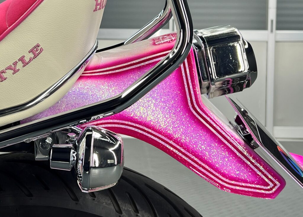 お預かりしたのは、見る者の視線を一瞬で奪う、全身ピンク&パールホワイトのカスタムが施された圧巻の車両。メッキパーツも各所で装備されており、往年の名車のスタイルをベースに、現代的なメッキパーツとラメの輝きを纏い鮮やかなカラーリングが融合した、唯一無二の存在感を放つ一台です。