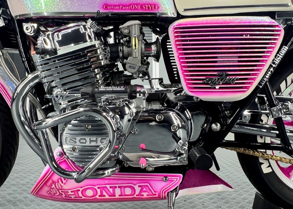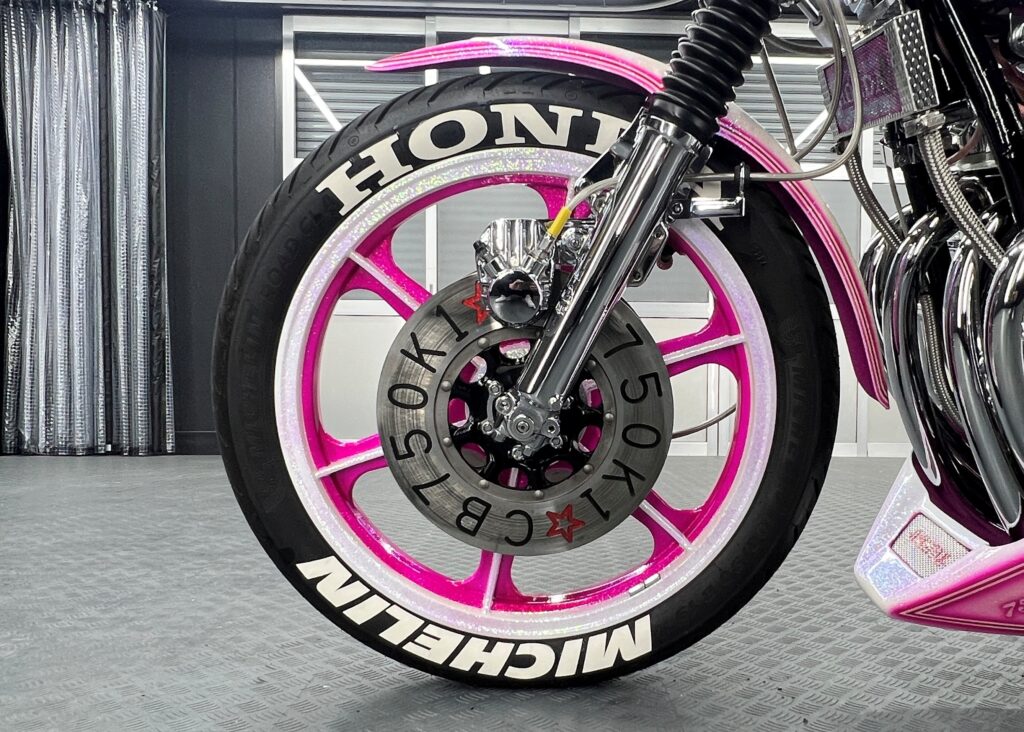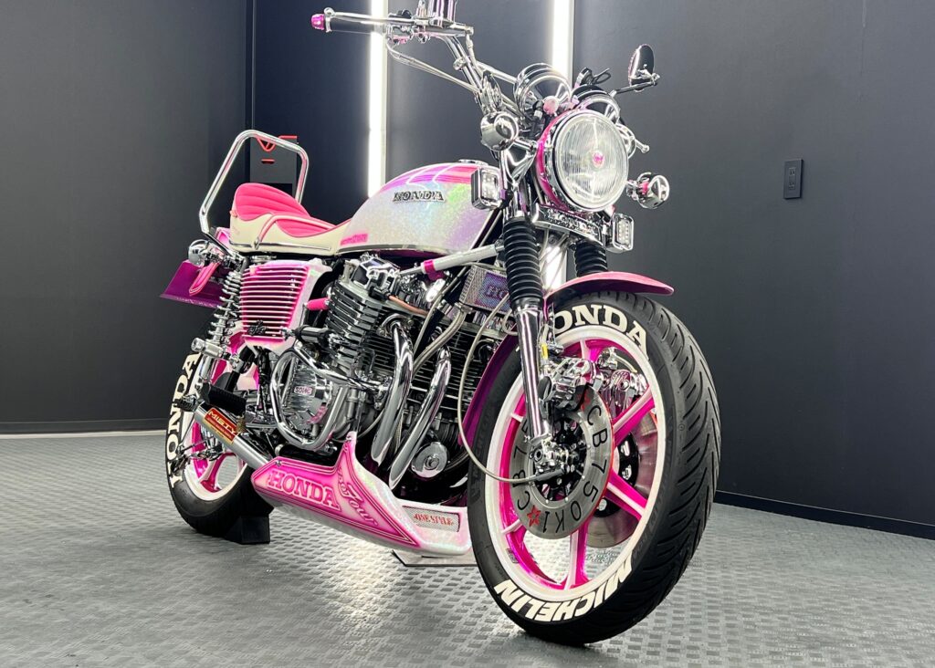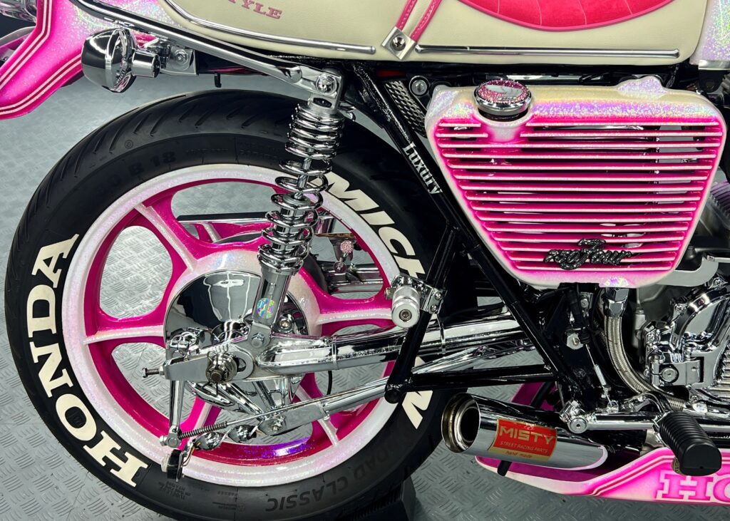 その力強いエンジン造形で、フロントからリアにかけて流れるようなカスタムライン、そしてホンダCB750Four のロゴを施したアンダーカウルとカウルから覗かせる、MISTYのマフラーが特徴的です。